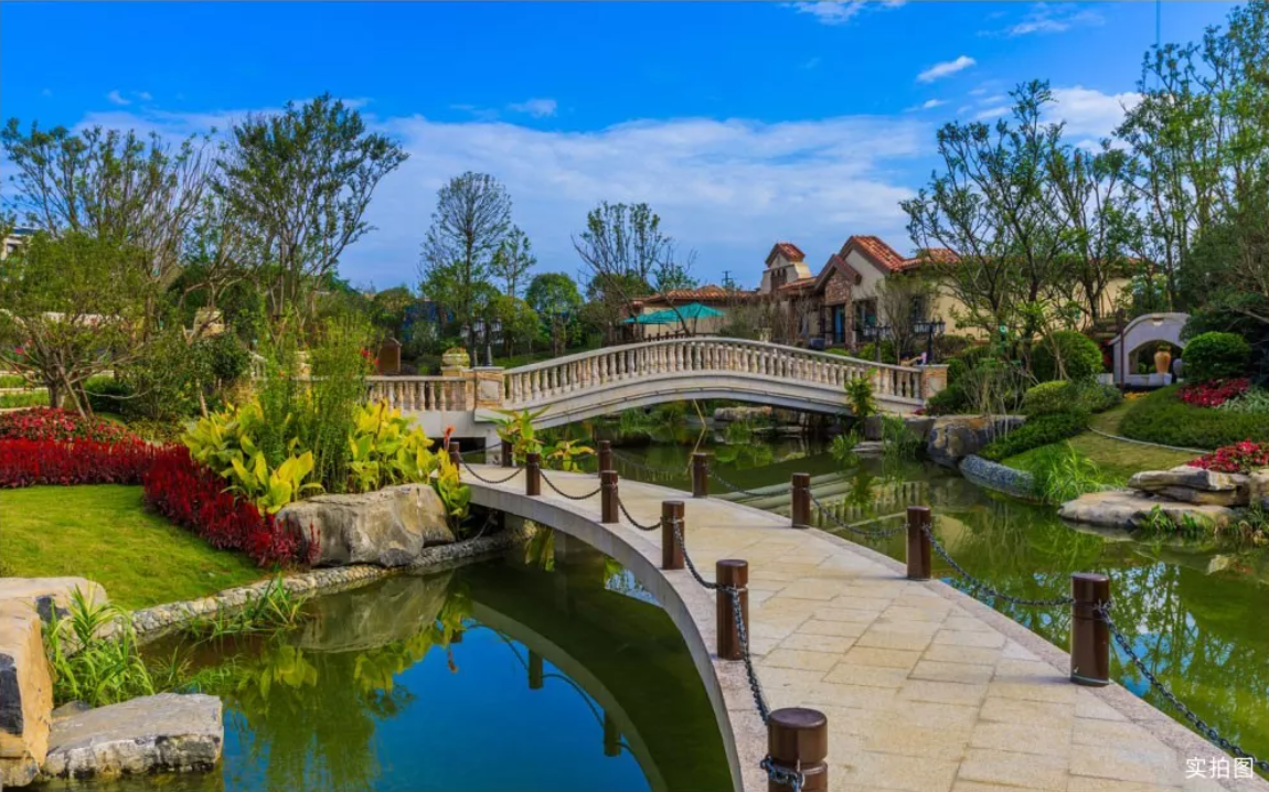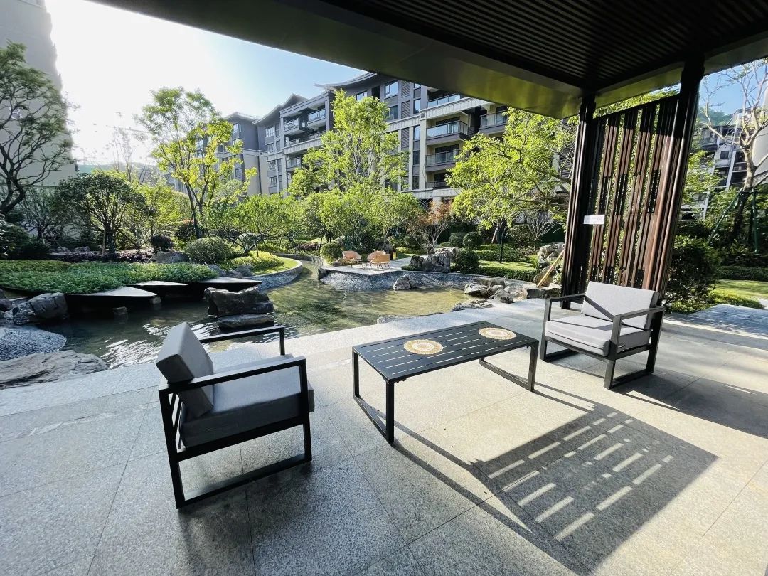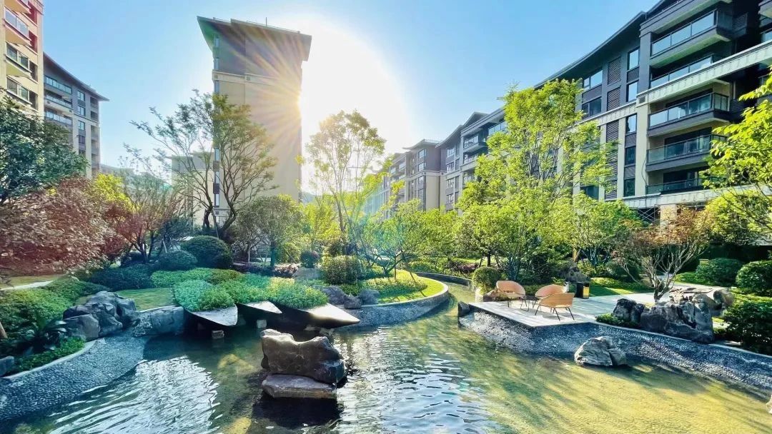 興進·御園交房現場,超低的建筑密度、高綠化的意式園林,一條靈劍溪蜿蜒地從小區(qū)中間穿過,業(yè)主漫步園中,沿溪而行,移步易景,仿若"人在畫中游"。