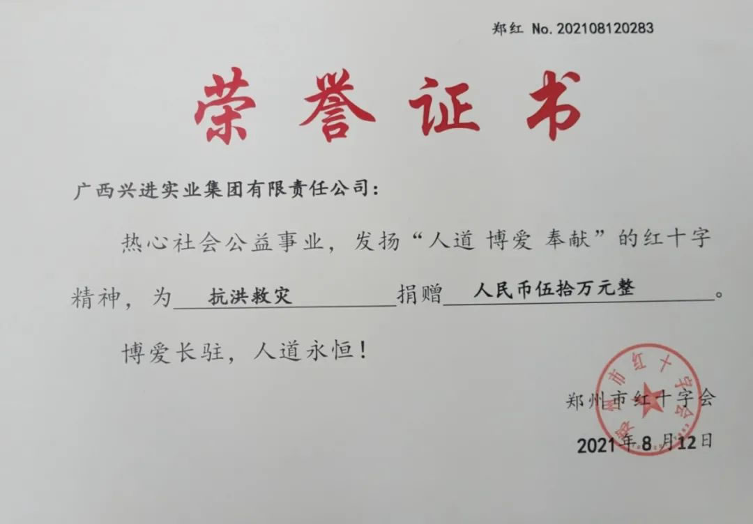 2019年,興進(jìn)集團(tuán)向桂林市教育發(fā)展基金會(huì)捐贈(zèng)100萬(wàn)元;2020-2021年,興進(jìn)集團(tuán)連續(xù)向桂林中學(xué)捐贈(zèng)"興進(jìn)·桂林中學(xué)優(yōu)秀獎(jiǎng)學(xué)金",鼓勵(lì)優(yōu)秀學(xué)子再接再厲。除了愛(ài)心助學(xué),興進(jìn)集團(tuán)也積極承擔(dān)社會(huì)責(zé)任。今年7月,興進(jìn)集團(tuán)通過(guò)鄭州市紅十字會(huì)向?yàn)?zāi)區(qū)捐贈(zèng)50萬(wàn)元善款,以實(shí)際行動(dòng)為受災(zāi)群眾、抗洪一線(xiàn)的救援人員提供有力支持。